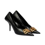 La décolleté ysl in foto e’ uno di quei modelli che diventano immediatamente riconoscibili grazie al tacco logo. La silhouette della scarpa e’ classica, con punta affusolata e linea slanciata in pelle nera lucida. Il vero protagonista pero’ e’ il tacco dorato che riproduce il monogramma YSL, trasformando un elemento tecnico in una parte di design. Il contrasto tra il nero profondo della tomaia e l oro lucido del tacco crea un effetto elegante ma anche molto scenografico. E’ una scarpa pensata per chi ama accessori iconici e non ha paura di attirare lo sguardo.