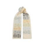 Lo stile e deciso e contemporaneo, perfetto per completare outfit urbani o casual. Si abbina facilmente a cappotti scuri, giacche oversize o capi minimal, creando un contrasto visivo interessante. Il tessuto appare morbido e abbastanza strutturato, probabilmente in lana o misto lana, pensato per offrire calore nelle stagioni piu fredde. Il design ampio consente di utilizzare il foulard anche come sciarpa avvolgente, mantenendo sempre visibili gli elementi grafici iconici.